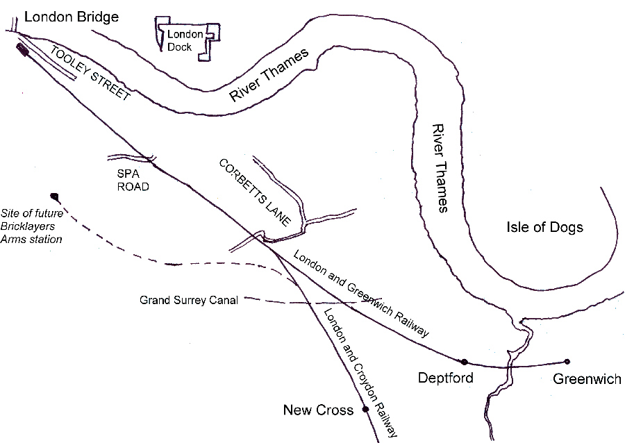 Following the success of other early railways, promoters put forward a scheme to link Croydon, then an industrial town, with London. The Croydon Canal of 1809 was moribund, and it was proposed to purchase it and to utilise its course. It was to extend northwards from the Croydon Canal terminal at New Cross, to make a junction at Corbetts Lane (then spelt Corbets Lane), in Bermondsey with the London and Greenwich Railway (see above). Its trains were then to run over that line to its London Bridge station. The line was 8 3⁄4 miles (14.1 km) long and at the southern end followed the alignment of the Croydon Canal from Anerley to a terminus at Croydon, with a locomotive depot, on the site of the canal basin. This was later to be developed to the present-day West Croydon station.The Greenwich company intended that its proposed London Bridge terminus would accommodate trains of several other companies and had acquired land sufficient for the purpose. At this time however it had inadequate funds to carry out the actual construction, and the Croydon company was obliged to do the work itself, taking some of the Greenwich company's land on the north side for the purpose.