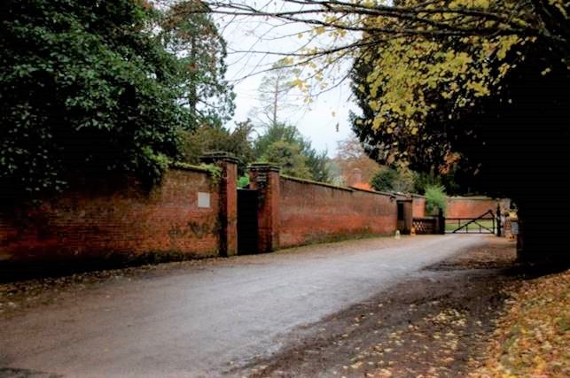 Continuing straight across the roundabout, the road heads toward Chevening, parallel with the M25. After a short while it bends to the left. The old entrance starts alongside the cottages shown in the photo above. It extends for about on mile and emerges behind the churchyard of St. Botulph's church in Chevening.