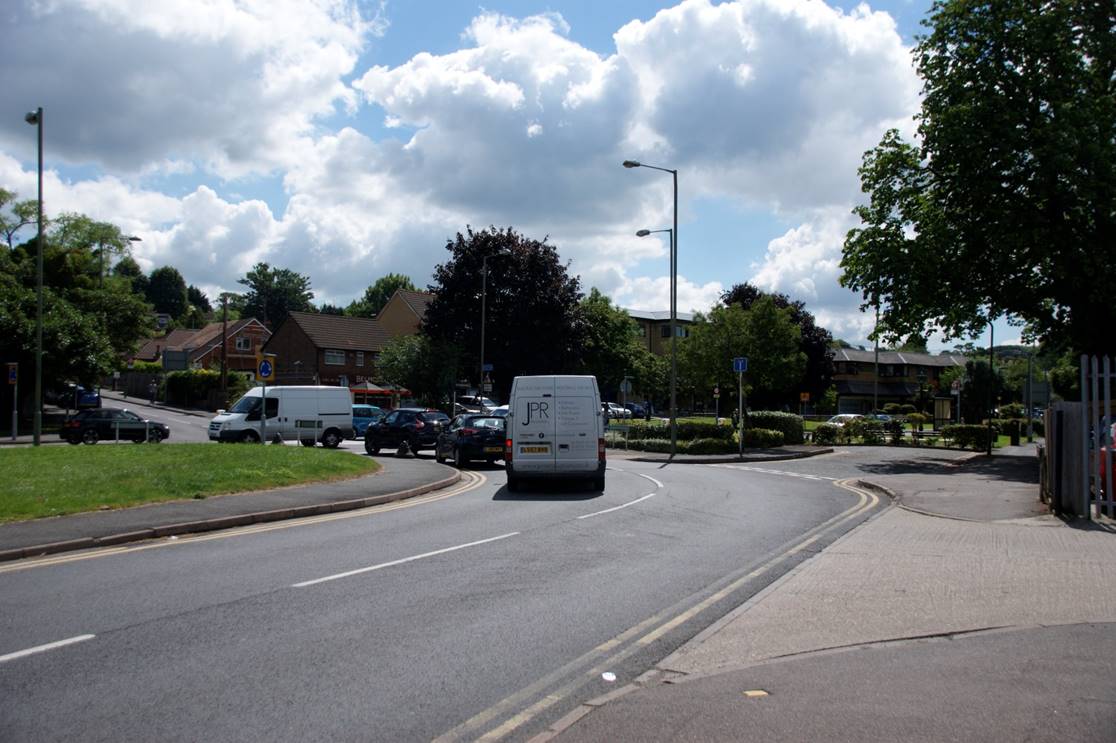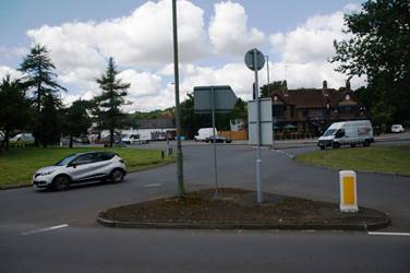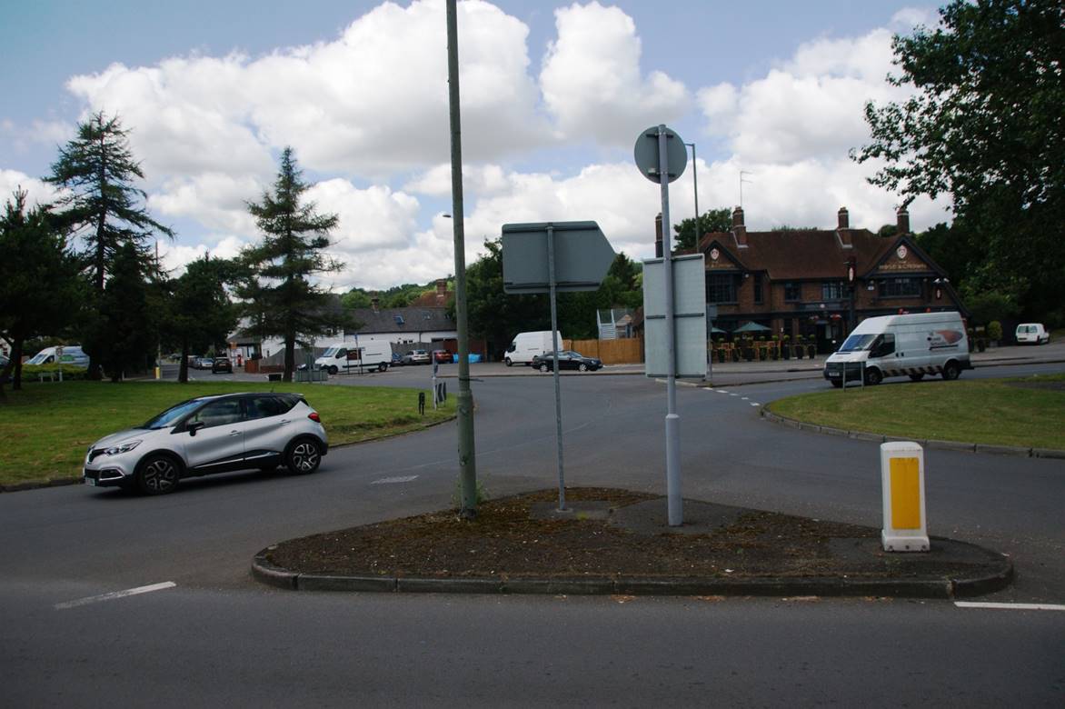 The route then runs through Green Street Green to rejoin the original one at today's roundabout.  In the photo below right the original route is in the distance where Old Hill emerges on the far side of the roundabout. Farnborough bypass is seen in the middle right where the van is joining, and the new route emerges from the right in the foreground having passed through Green Street Green.