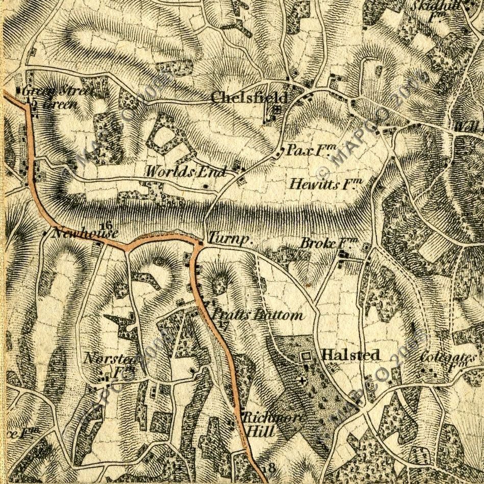 The first change was the diversion of the route after the George and Dragon to create the High Street and Farnborough Hill down to Green Street Green; and then continue through that village to rejoin the original route at the far end of Old Hill.  This may also be when the High Road was renamed Church Road.