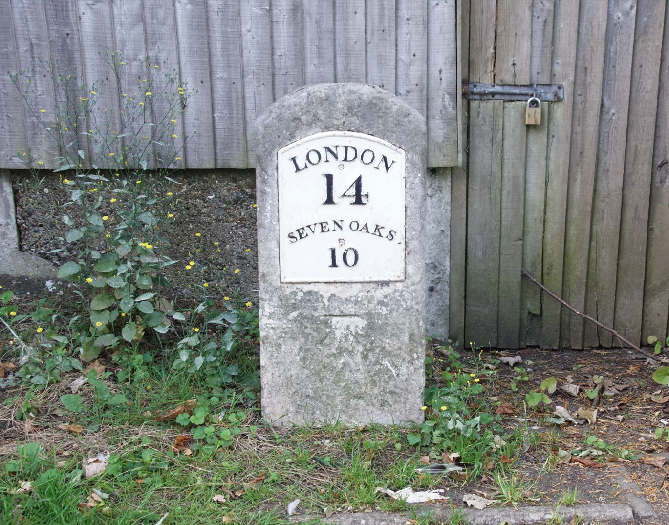 Thin, rectangular milestone with plate which reads LONDON/14/SEVENOAKS/10. Located on the New Cross Turnpike road of 1718.