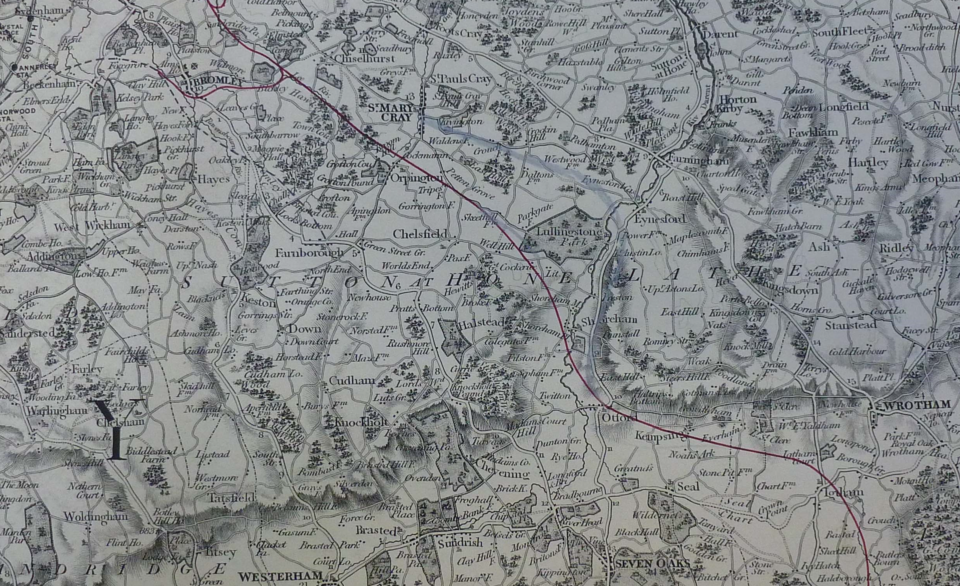 This second map shows a close-up of the alignment in the area from Bromley southward past Farnborough and Orpington, then via Lullingstone and Otford..