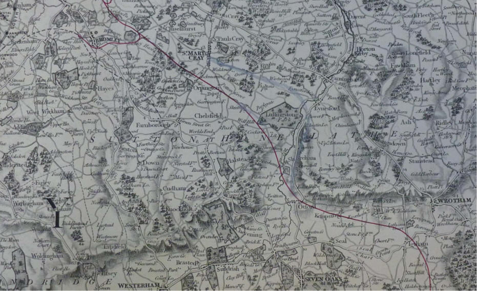 As can be seen from the maps it passed to the east of Bromley, with a connection to the proposed West End of London and Crystal Palace Railway line from Beckenham to Farnborough. It then continued between Orpington and St. Mary Cray to enter the Darenth Valley, which afforded the easiest way to the south, through the only gap in the north downs.