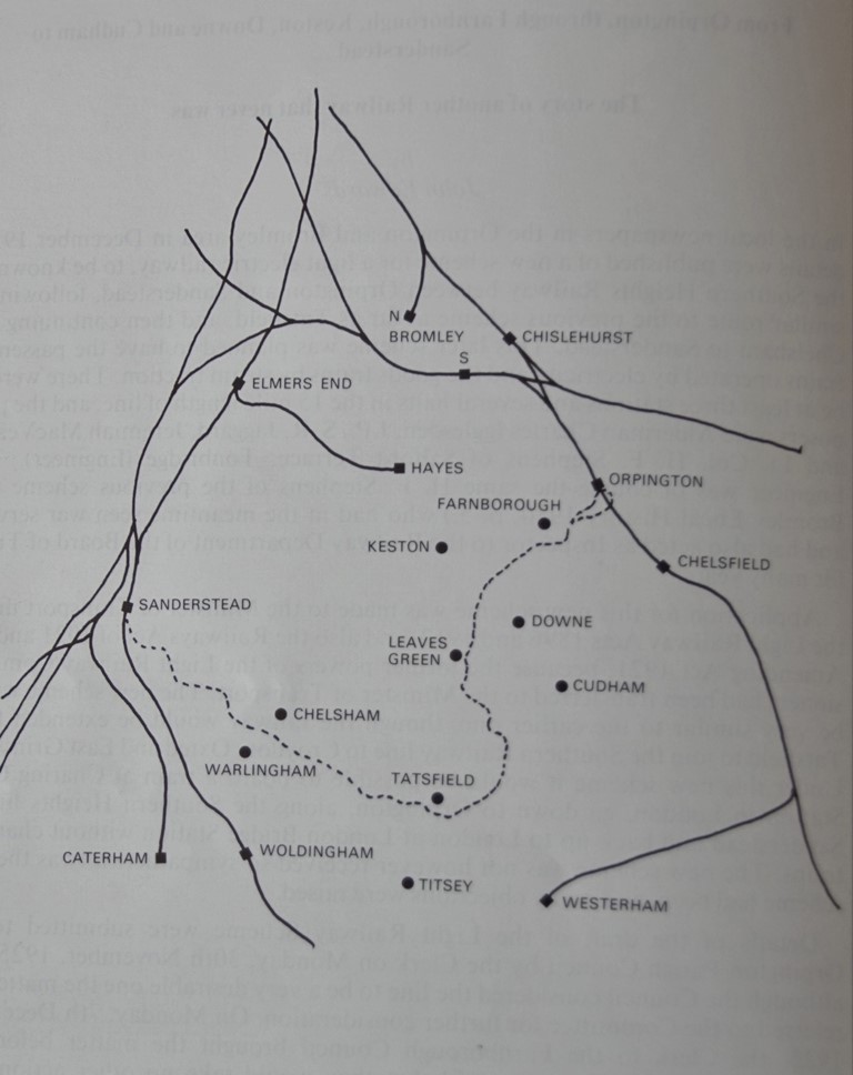 The line would commence just south of Orpington station, where there would be connections to both the up and down main lines. The two spurs would combine a short distance from the station, and from that point on the line would be single track. It would initially head south through Farnborough, Keston, Downe, Cudham and Biggin Hill to Tatsfield, then west via Titsey, Chelsham and Warlingham to Sanderstead, just south of Croydon, where it would meet the main line to London from Uckfield and East Grinstead, see map. Through services onto the main lines at both ends were envisaged, with trains able to originate from and terminate at Charing Cross and Victoria respectively. The central section being a Light Railway would be subject to a 25mph speed limit. The line would be fully electrified for use by passenger trains, while freight services would be steam-hauled..