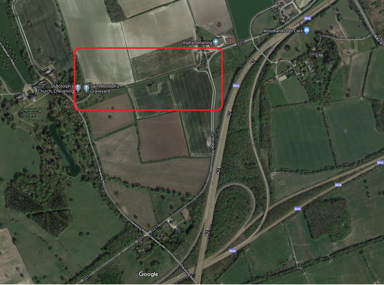 Continuing straight across the roundabout, the road heads toward Chevening, parallel with the M25. After a short while it bends to the left. The old entrance starts alongside the cottages shown in the photo above. It extends for about on mile and emerges behind the churchyard of St. Botulph's church in Chevening.