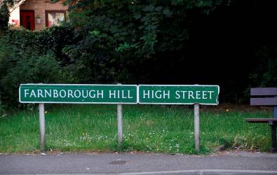 The new route started in the village, taking the path along the High Street to the left of the modern housing shown above, which is on the site of the old George and Dragon. The start of the new Farnborough Hill road is indicated by these modern roadsigns opposite Tubbenden Lane South.  The route then proceeds down Farnborough Hill, across Farnborough Bypass, built in 1927, to enter Green Street Green.