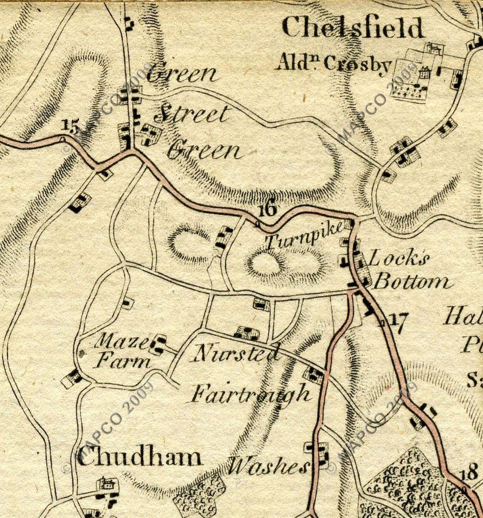 The route from Farnborough down to Green Street Green may have existed as a track before 1800, but it is not shown on the first map, and was clearly not suitable for heavy coach traffic. But by the beginning of the nineteenth century the naturally marshy ground in Green Street Green had been drained, enabling the road to be improved. As a consequence Green Street Green had started to expand from what had previously been little more than a hamlet, and the turnpike route was changed to use Farnborough Hill and run through Green Street Green.